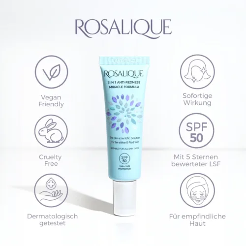Speziell für überempfindliche und zu Rötungen neigender Haut entwickelt. Rosalique bietet einen sofortigen Abdeckeffekt durch seine einzigartige mikroverkapselte Technologie und bietet klinisch erprobte Inhaltsstoffe wie α-Bisabolol, Zeolith, Provitamin B5, Urea und Sheabutter, die Rötungen reduzieren. Durch den Lichtschutzfaktor von 50 bleibt Ihre Haut langfristig vor UVA/UVB-Strahlen geschützt.
